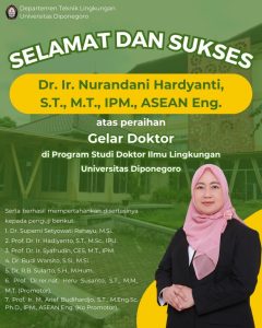 Dr. Ir. Nurandani Hardyanti S.T., M.T., IPM., ASEAN Eng sukses mendapatkan gelar yang membanggakan tersebut setelah berhasil mempertahankan disertasinya di depan tim penguji yang terdiri dari Dr. R.B. Sularto, S.H., M.Hum., Dr. Budi Warsito, S.Si., M.Si., Dr. Suparni Setyowati Rahayu, M.Si., Prof. Dr. Ir. Hadiyanto, S.T., M.Sc. IPU, dan Prof. Dr. Ir. Syafrudin, CES, M.T., IPM, serta termasuk Tim Promotornya yakni Prof. Dr.rer.nat. Heru Susanto, S.T., M.M., M.T. dan Prof. Ir. M. Arief Budiharjo, S.T., M.Eng.Sc., Ph.D., IPM., ASEAN Eng. Semoga dengan diraihnya gelar Doktor dalam Bidang Ilmu Lingkungan, Bu Nurti (sapaan akrab beliau) dapat bermanfaat dan berkah dan bermanfaat untuk pengembangan ilmu pengetahuan dan teknologi Universitas Diponegoro maupun Departemen Teknik Lingkungan.