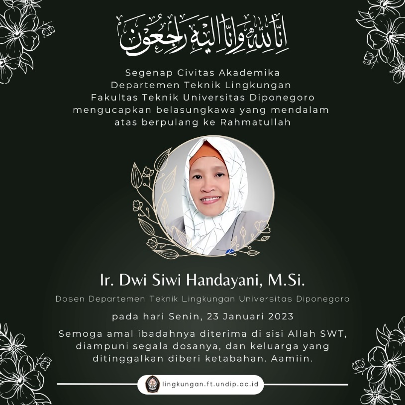 Segenap civitas akademika Departemen Teknik Lingkungan Universitas Diponegoro mengucapkan turut berduka cita atas meninggalnya Ibu Ir. Dwi Siwi Handayani, M.Si. Semoga amal ibadah almarhumah diterima disisi Allah Subhanahu Wa Ta’ala, diampuni segala dosanya, dan keluarga yang ditinggalkan diberi kesabaran dan ketabahan. Aamiin.