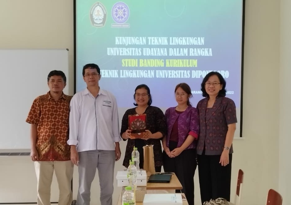 Semarang (1/11) – Departemen Teknik Lingkungan Universitas Diponegoro. Departemen Teknik Lingkungan mendapat kunjungan dari Program Studi Teknik Lingkungan Universitas Udayana. Kunjungan tersebut dilaksanakan pada hari Senin, 31 Oktober 2022 bertempat di ruang Gedung Teknik Lingkungan Universitas Diponegoro. Acara tersebut dihadiri oleh Dr. Ing. Sudarno, S.T., M.Sc. selaku Ketua Departemen Teknik Lingkungan, Dr. Ir. Badrus Zaman, S.T., M.T., IPM. selaku Ketua Program Studi S1 Teknik Lingkungan, Dr. Ir. Haryono Setiyo Huboyo, S.T., M.T., IPM. selaku Ketua Program Studi S2 Teknik Lingkungan dan 3 Dosen dari Universitas Udayana.